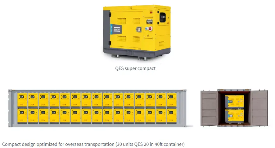 Model QES super kompak yang inovatif dirancang untuk memberikan transportasi paling efisien. Anda dapat memuat hingga 30 unit Atlas Copco QES 20 dalam kontainer berukuran 40 kaki, jumlah terbesar untuk Generator Atlas berdaya 20kVA yang ada di pasaran! Hal ini berarti transportasi yang lebih optimal, pengurangan emisi CO2 dan biaya operasional, sehingga menghasilkan Total Biaya Kepemilikan (TCO) yang lebih rendah. Desainnya yang ramah lingkungan membuatnya ideal untuk penyimpanan di luar negeri, sehingga mengurangi jejak Anda di tempat secara signifikan.