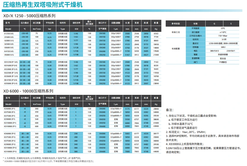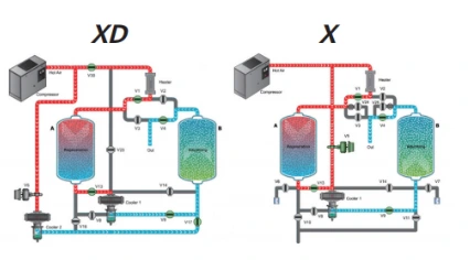 Pengering adsorpsi panas kompresi XD atau X menggunakan adsorben berkualitas tinggi dan secara efisien memanfaatkan panas kompresi dari kompresor bebas oli untuk meregenerasi adsorben, sehingga secara signifikan mengurangi konsumsi energi dan biaya pemeliharaan.