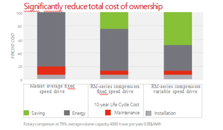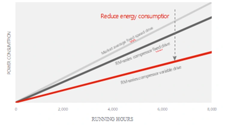 setiap kompresor udara seri RM dilengkapi dengan unit utama baru yang berefisiensi tinggi, menggabungkan motor berkecepatan tetap IE3 dan teknologi motor frekuensi variabel ECO*-PM VSD IE5, membantu Anda menghemat biaya energi hingga 12-30%.