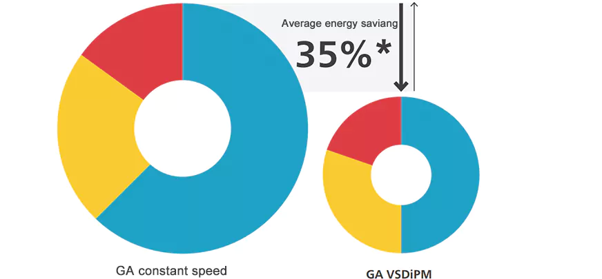 Kompresor seri VSDiPM yang sangat efisien menghemat rata-rata hingga 35%* energi dibandingkan dengan kompresor yang digerakkan pada kecepatan tertentu